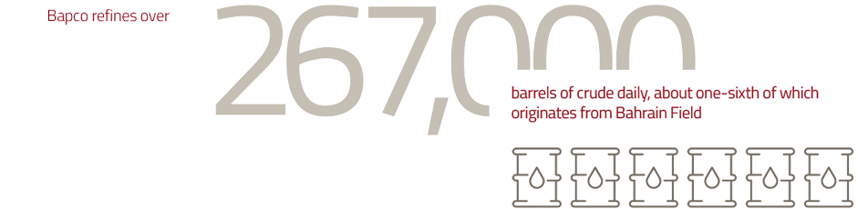 Bapco Refining refines over 267,000 barrels of crude daily, over one-sixth of which originates from the Bahrain Field while the remainder is pumped from Saudi Arabia through pipelines extending 42 km onshore in Saudi Arabia, 28 km onshore in Bahrain and 42 km running offshore.